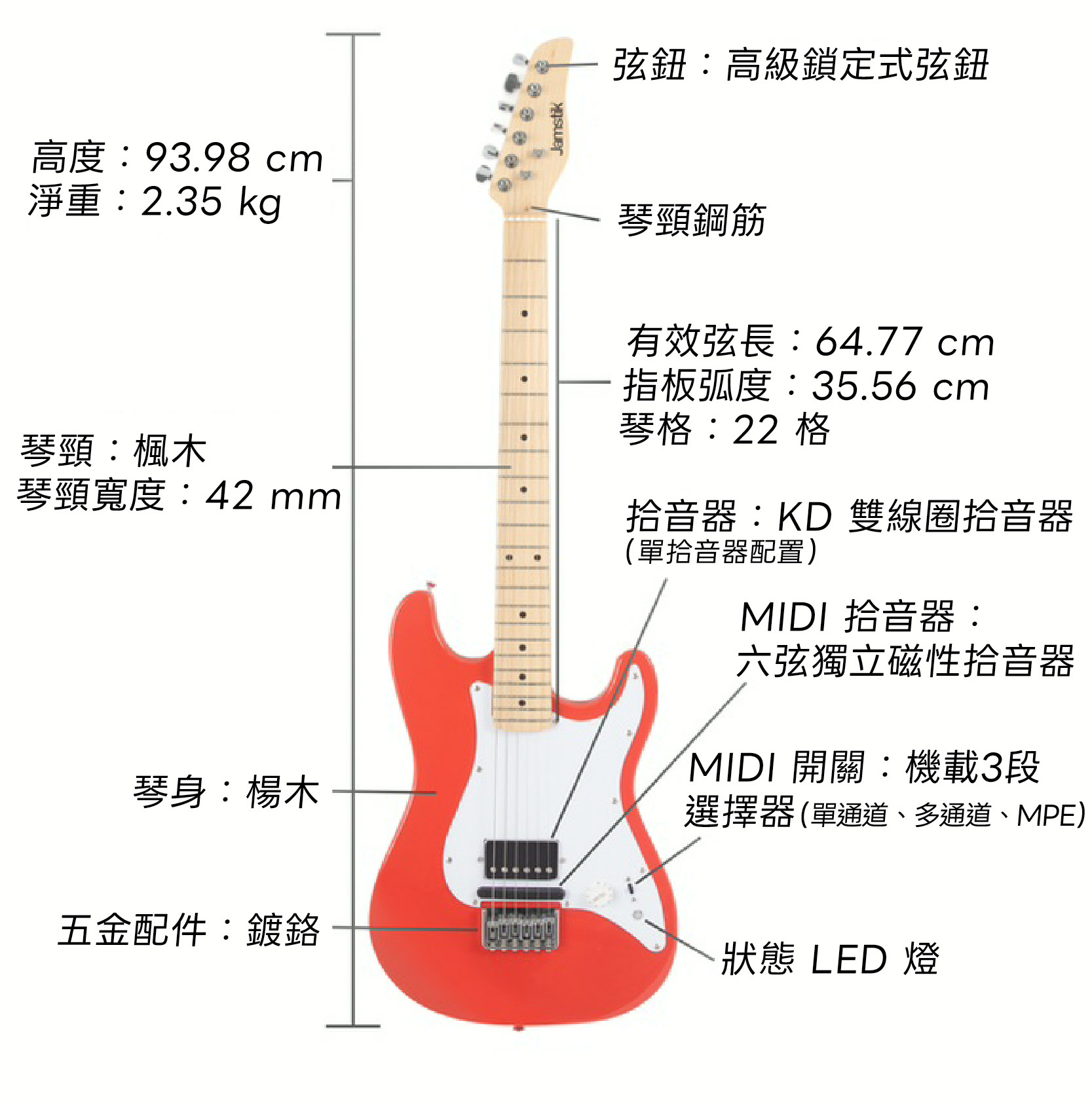 - 指板:楓木,琴頸寬度 1.65 吋(42mm)