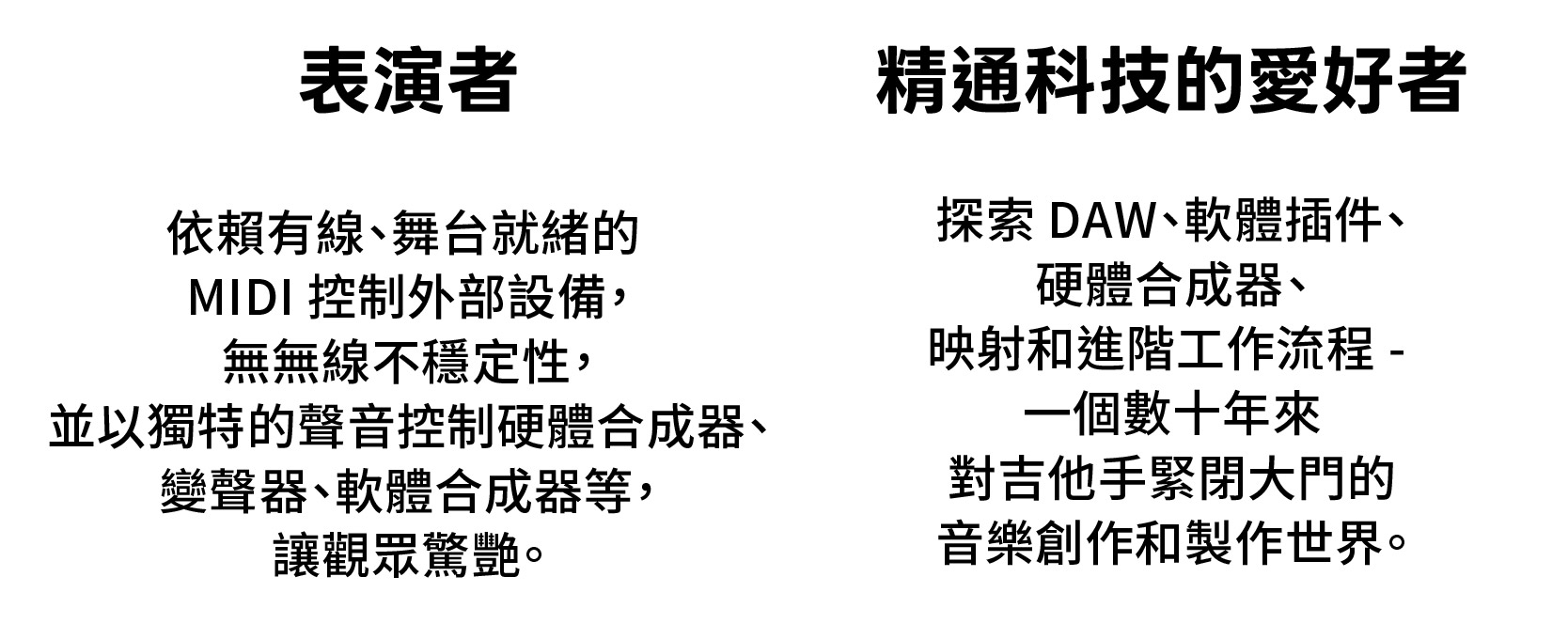 Jamstik 的先進演算法能偵測並轉譯最複雜的演奏技巧,包括:複音推弦、滑音、擊弦、勾弦、點弦、消音與悶音。