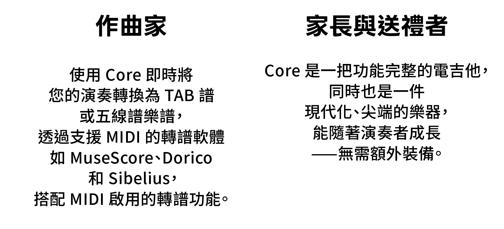 Core 是 3/4 尺寸實心電吉他,配備完整 22 琴格、標準 25.5 吋弦長、單雙線圈拾音器、音量控制與 1/4″ 吉他輸出孔。因此您可以將它作為主要電吉他,搭配音箱、錄音介面、吉他效果插件、效果器踏板、虛擬音箱模擬器等使用。