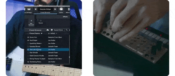 Jamstik 追蹤每條弦振動的強度變化,實現合成器音色在衰減時音量與明亮度的自然控制——非常適合真實的悶音與細膩的演奏風格。