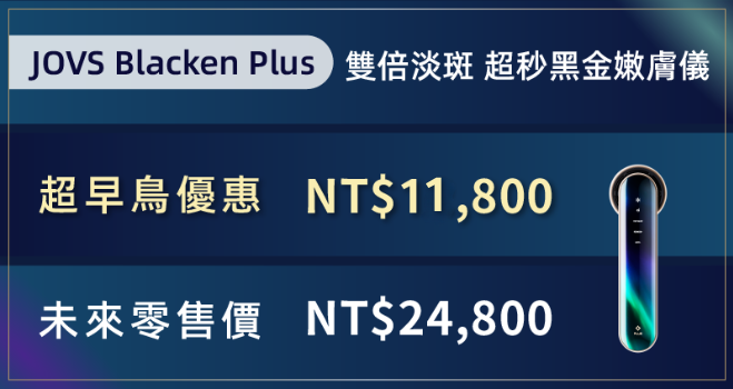 JOVS Blacken 以其首創 DPL精準窄光譜家用化技術,鎖定精準的500-650nm窄譜光,實現醫美家用化,全新Plus版本,增加700-800nm波段,一次發射兩種黑金波段,雙倍標靶瓦解真皮全層黑色素,精準打擊紅黑黃斑,3分鐘即時亮白,快速實現緊緻嘭彈!0 出行、0 預約成本,無限次發數,一次購入便能永久使用。