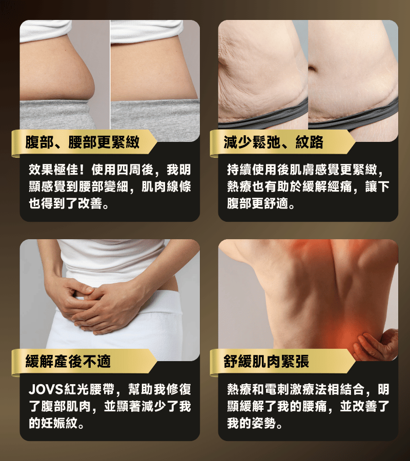 A: JOVS EMS 腹部緊緻修復 熱感紅光腰帶 採用8段式柔性關節設計,可舒適地貼合70公分至105公分的腰圍。它能適應各種體型,確保有效接觸和持續治療。