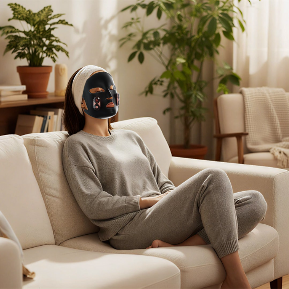 再戴上面膜儀。啟動後,微電流可協助打開肌膚微通道、加速精華滲透,提升整體吸收與保養效果。