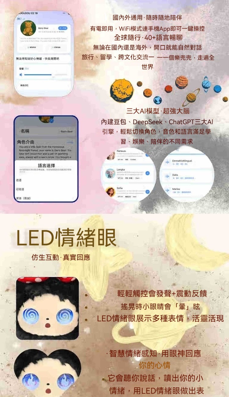 布魯諾豹【表情顯示+觸摸感應+多國語音+多種角色】, 帕芙泡【表情顯示+觸摸感應+多國語音+多種角色】, 璃洛【表情顯示+觸摸感應+多國語音+多種角色】, 米拉莓【表情顯示+觸摸感應+多國語音+多種角色】, 艾洛灰【表情顯示+觸摸感應+多國語音+多種角色】, 艾茲海【表情顯示+觸摸感應+多國語音+多種角色】, 諾提斯【表情顯示+觸摸感應+多國語音+多種角色】