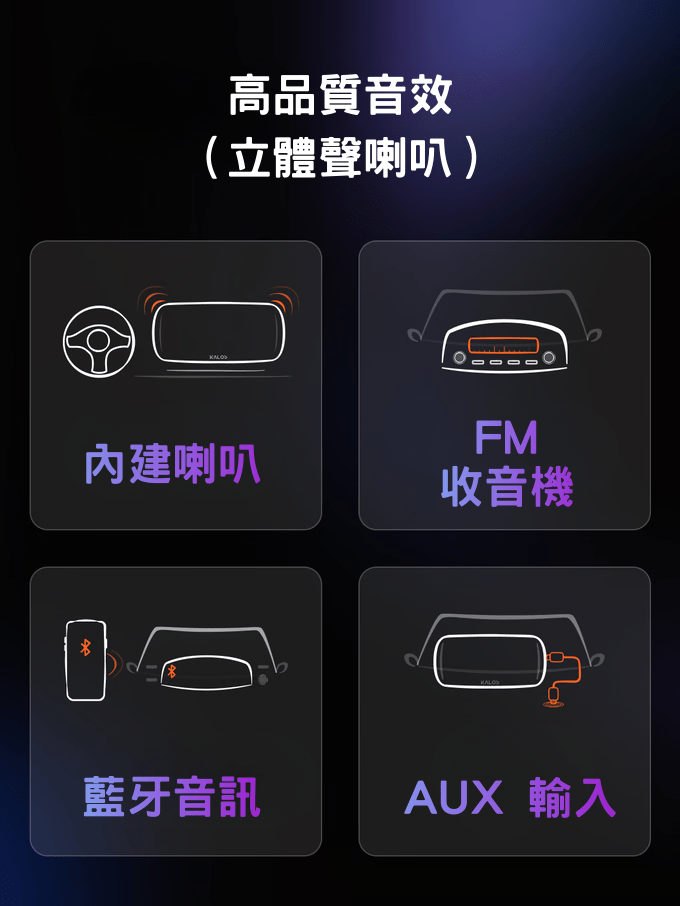 搭載雙聲道立體揚聲器與先進音效處理演算法,提供多種輸出選項——內建喇叭、FM 發射器、AUX 連接 – 讓你自由打造專屬音效體驗。聲音清脆均衡,無論是語音指令或音樂播放,都能更清晰、更悅耳。