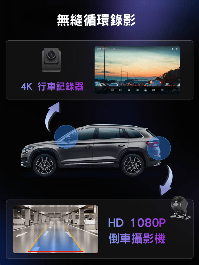 A: 前鏡頭支援 4K 錄影,後鏡頭為 1080P,雙鏡頭同步記錄前後路況,清晰捕捉每個細節,保障行車安全。