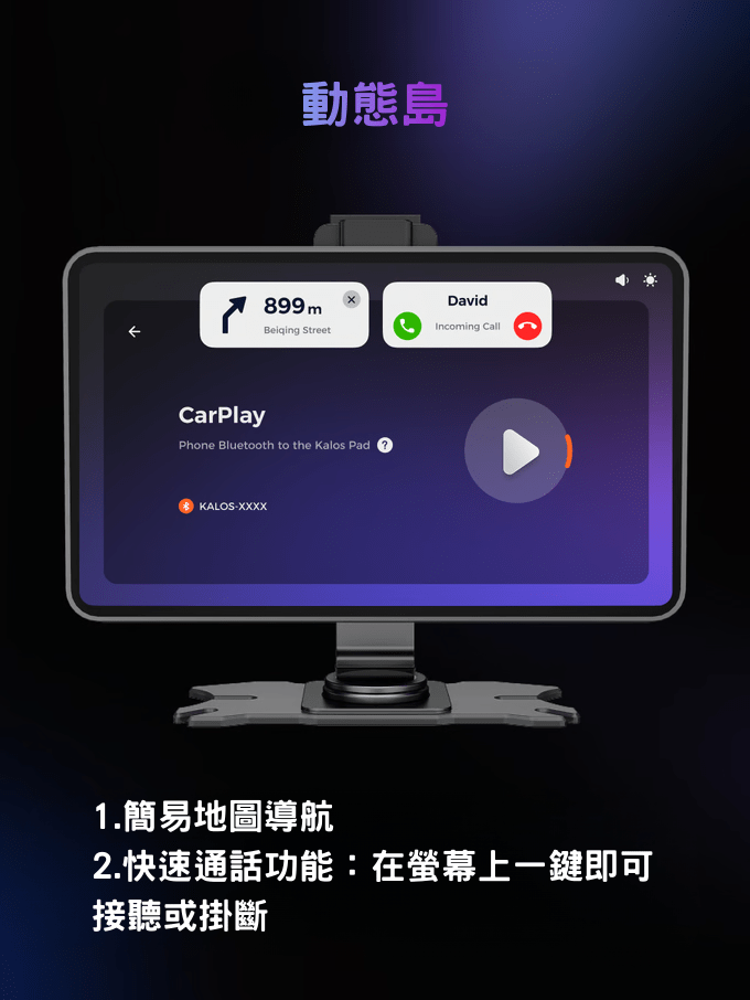 讓日常駕駛互動更順暢。當你停留在主畫面時,它會以小巧、不突兀的彈窗顯示來電通知,讓你能直接接聽而不影響主要畫面。動態島的設計保持介面乾淨、專注,減少不必要的全螢幕干擾,確保流暢且零分心的使用體驗。