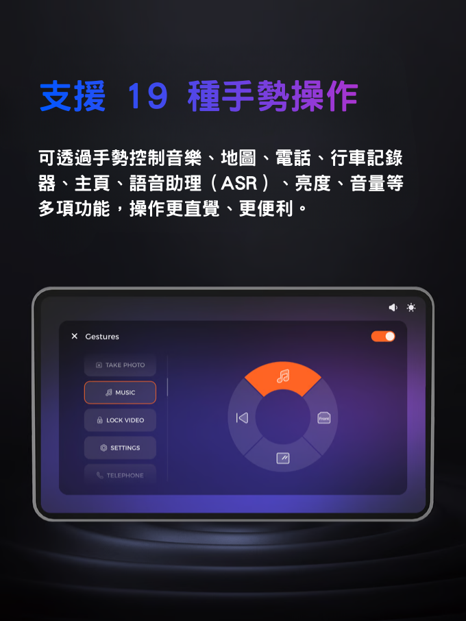 結合實用的手勢操作,打造直覺且靈敏的介面。使用者可透過上滑、下滑、左滑、右滑、雙指縮放與點擊等手勢,快速完成捲動、縮放、選單導航與應用互動。這套精簡的手勢設計,讓駕駛能以最少的分心完成常見操作,同時提升安全性與便利性。