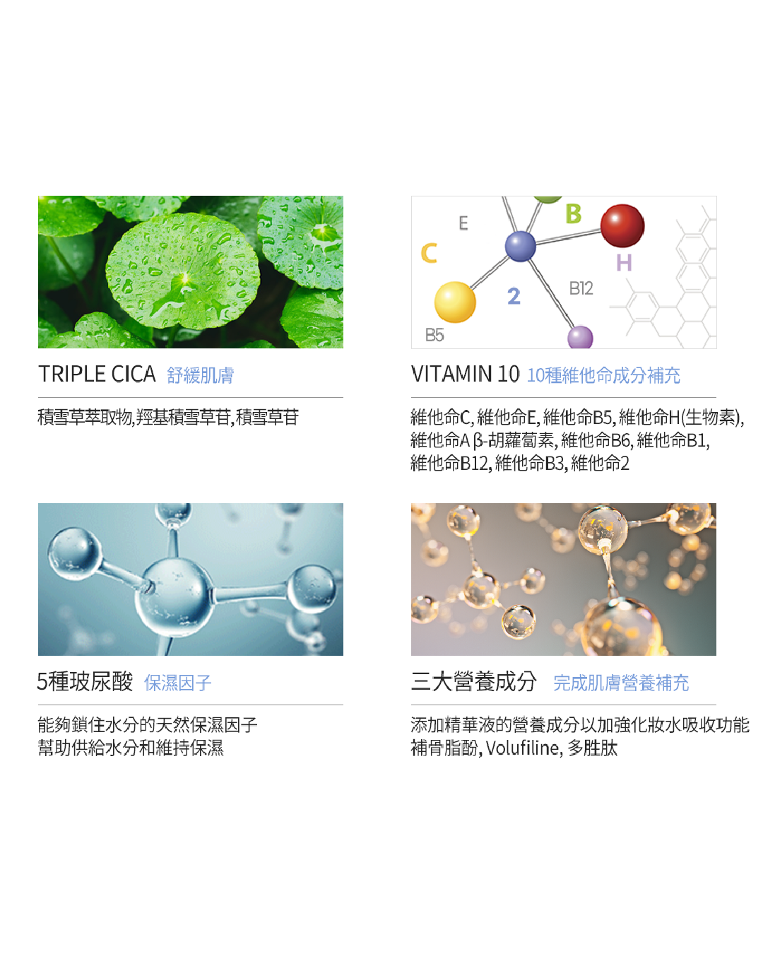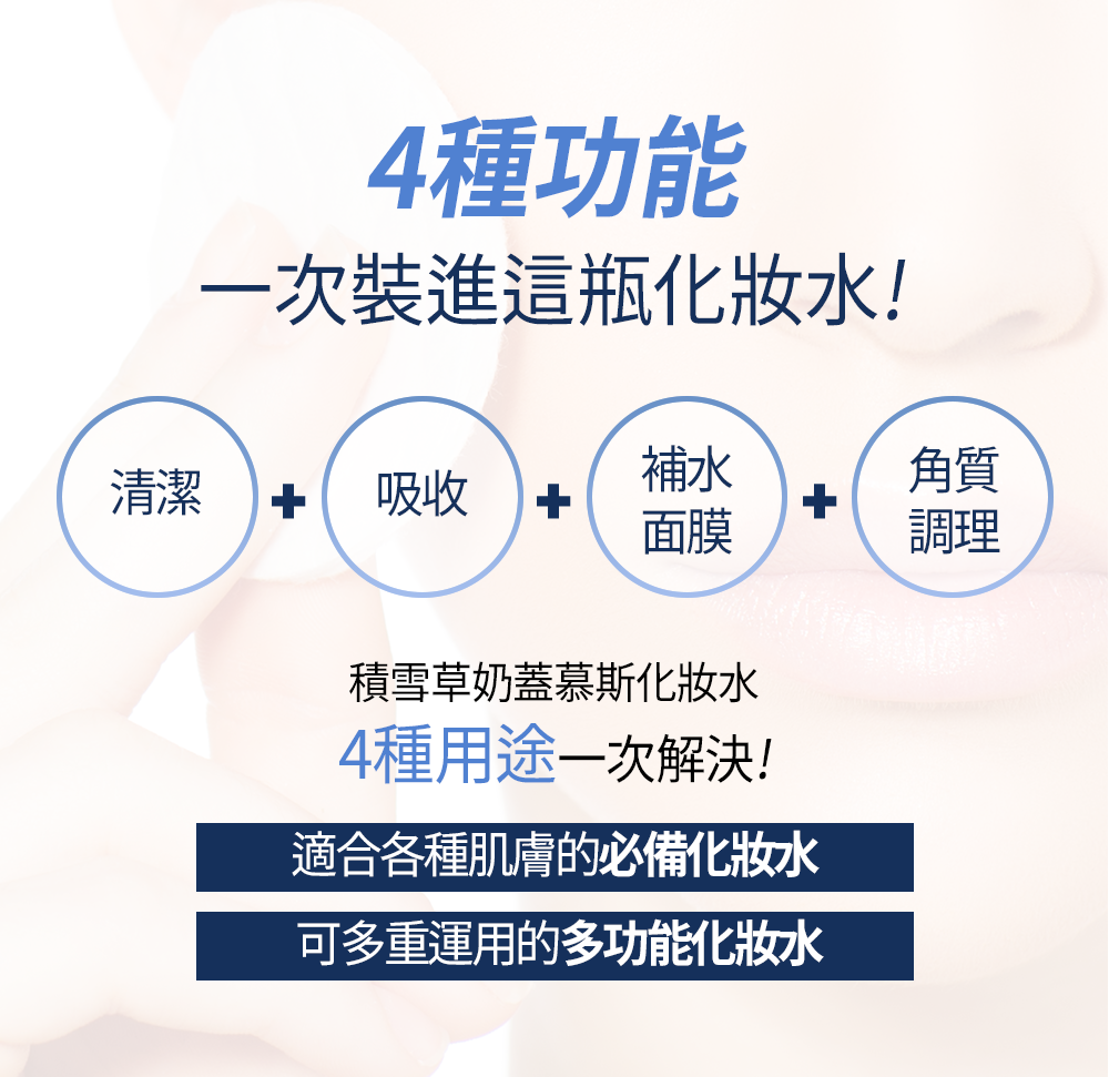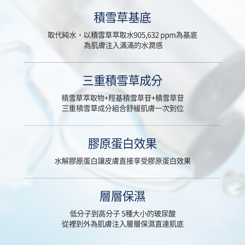 ▸以積雪草萃取水取代純水為基底,鎮靜保濕