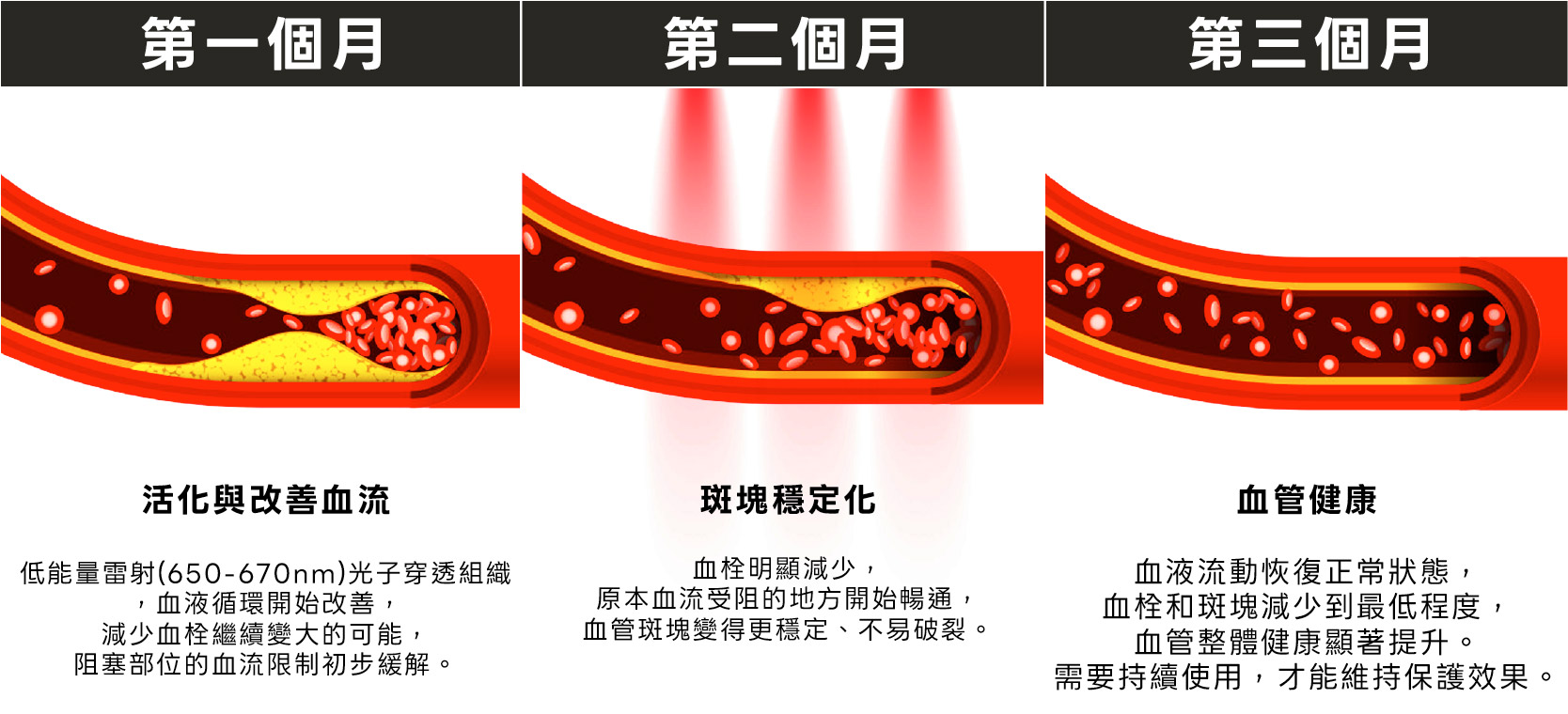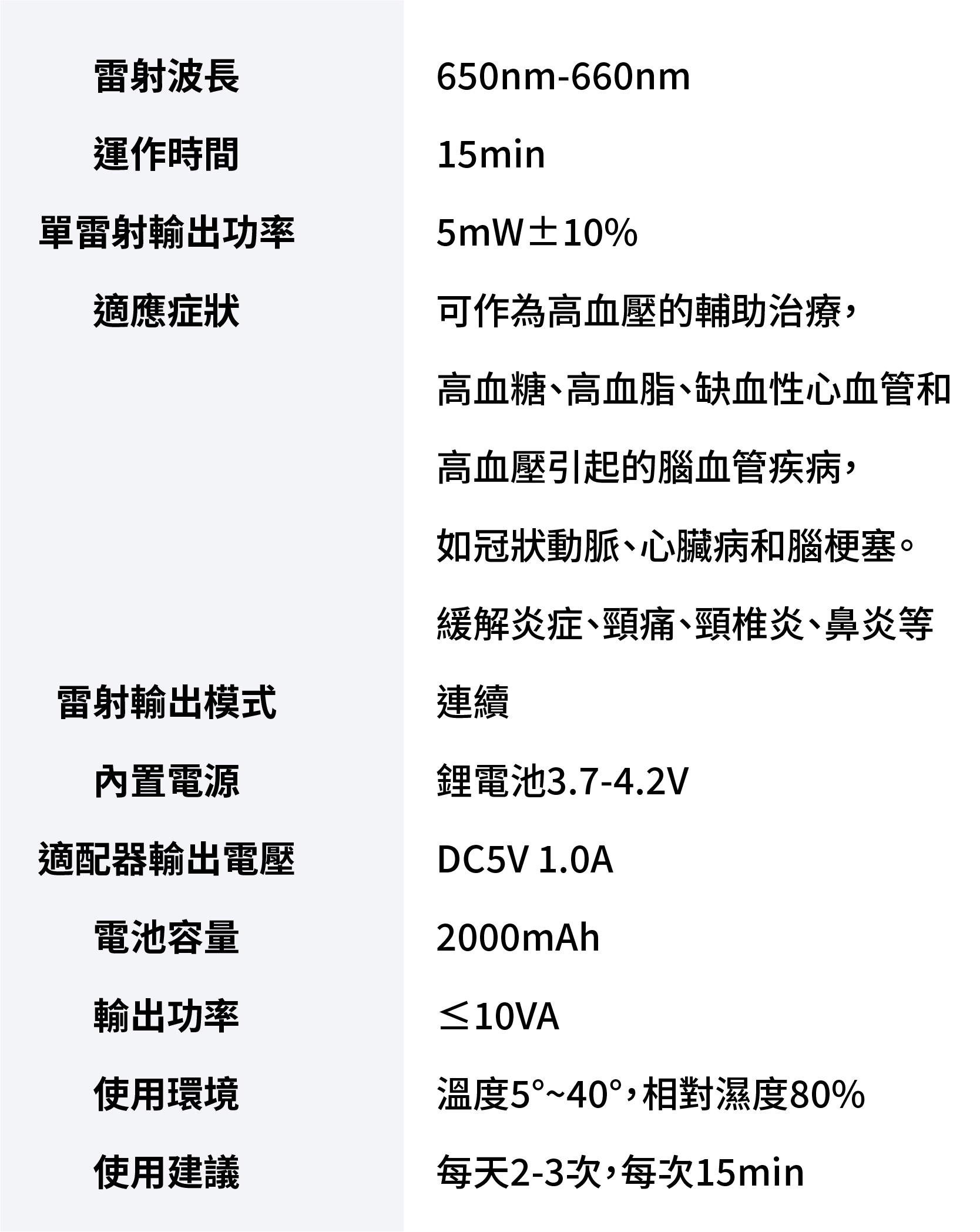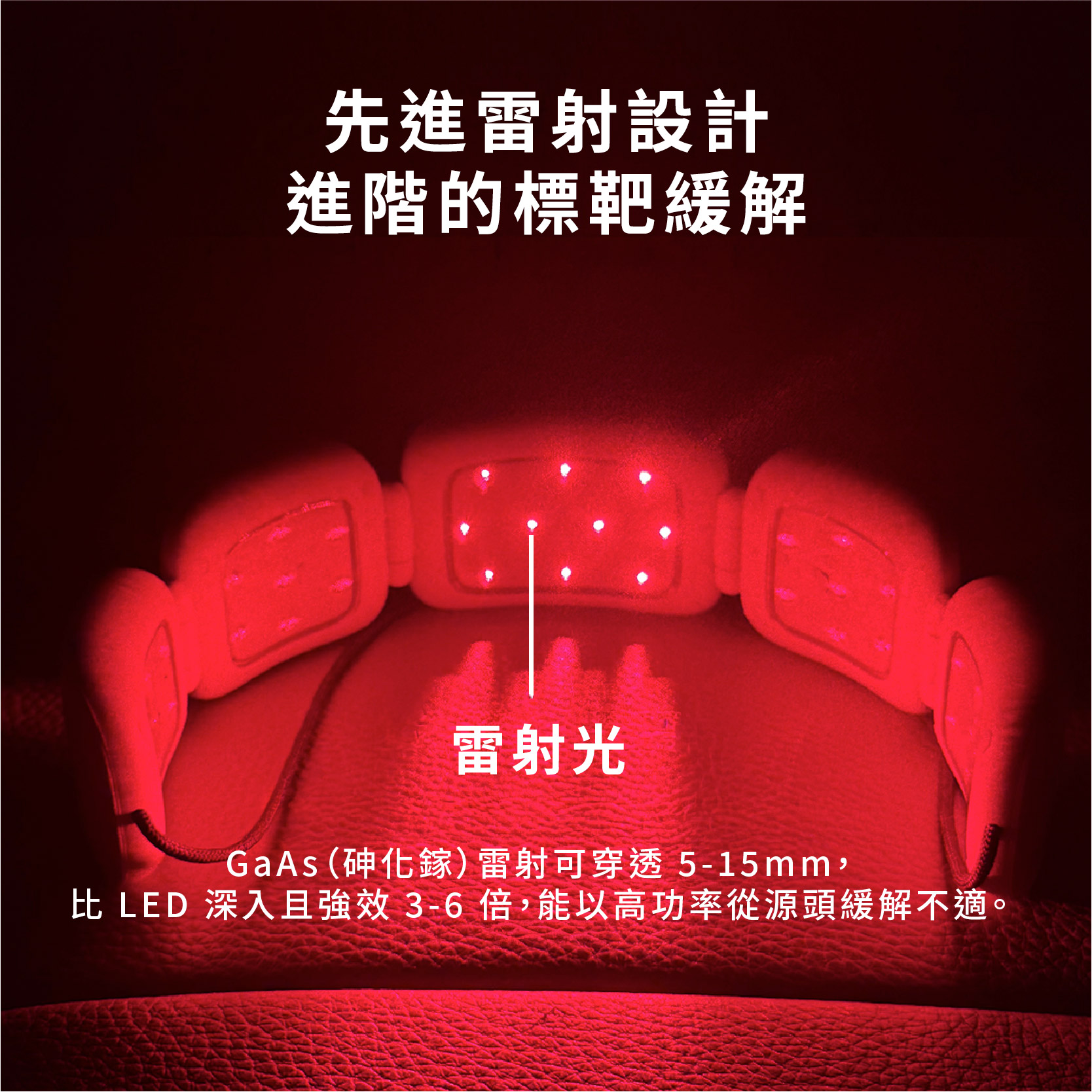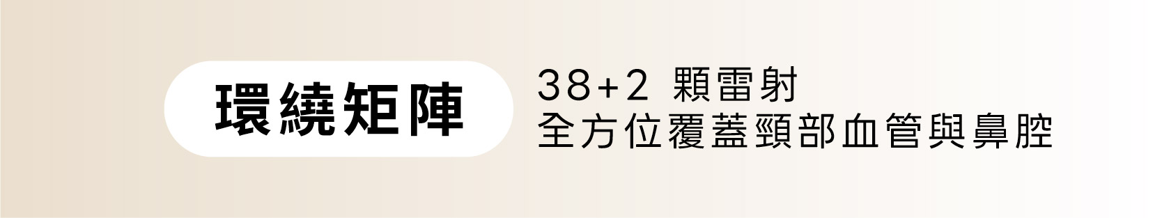 38+2 顆全雷射提供 360° 覆蓋、多靶點深層介入,以及開創性的圓形矩陣排列技術。360 度環繞光場使能量密度比傳統單面照射提高數倍,在單次 15 分鐘的療程中實現「清通血管、消炎止痛」的雙重目標。