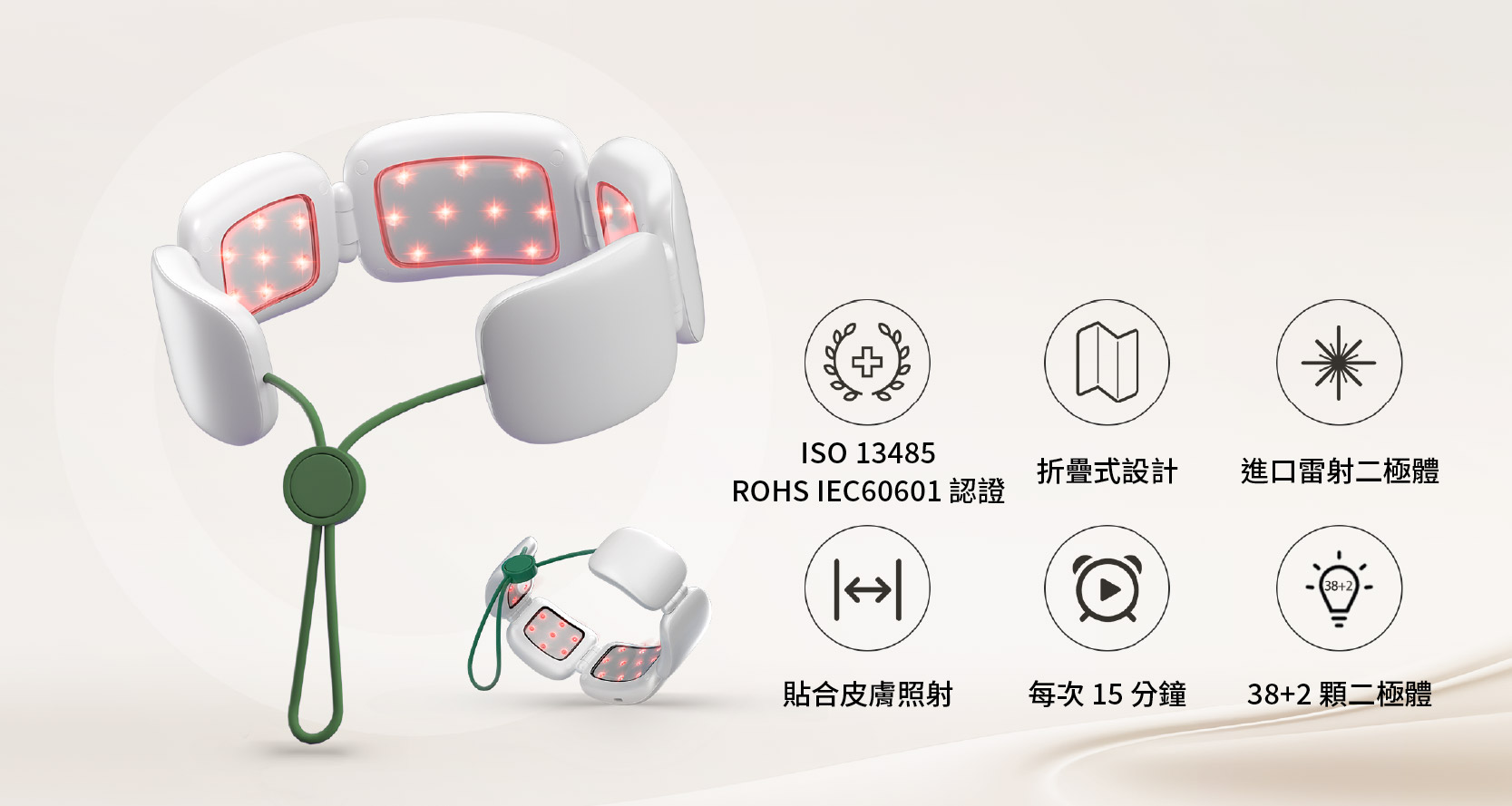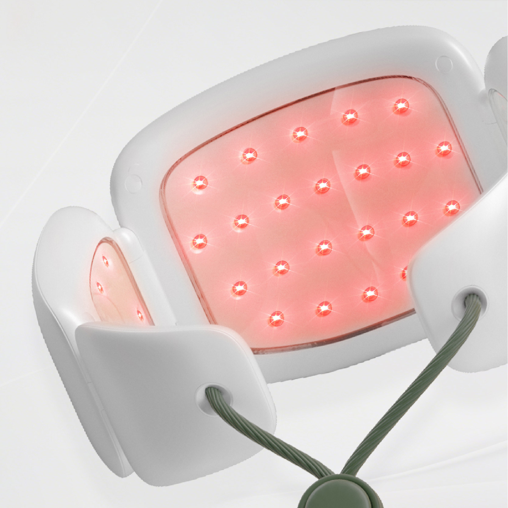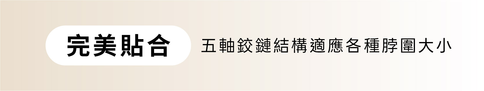 基於人體工學的五軸鉸鏈結構,設備可從 40° 到 220° 自由折疊,完美適應頸椎的生理曲度與頸部肌肉的方向。表面由親膚材質製成,配有收縮帶(可適應各種頸圍)。