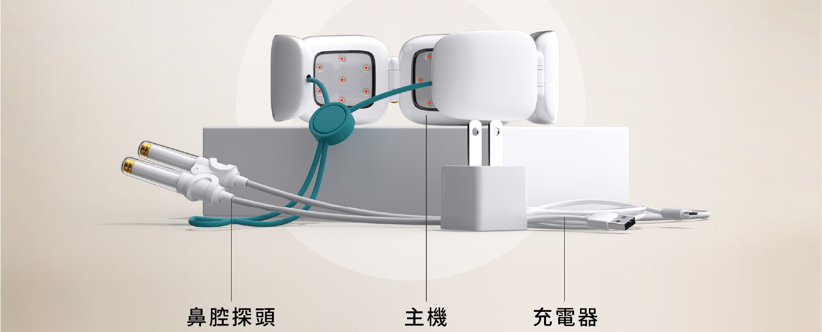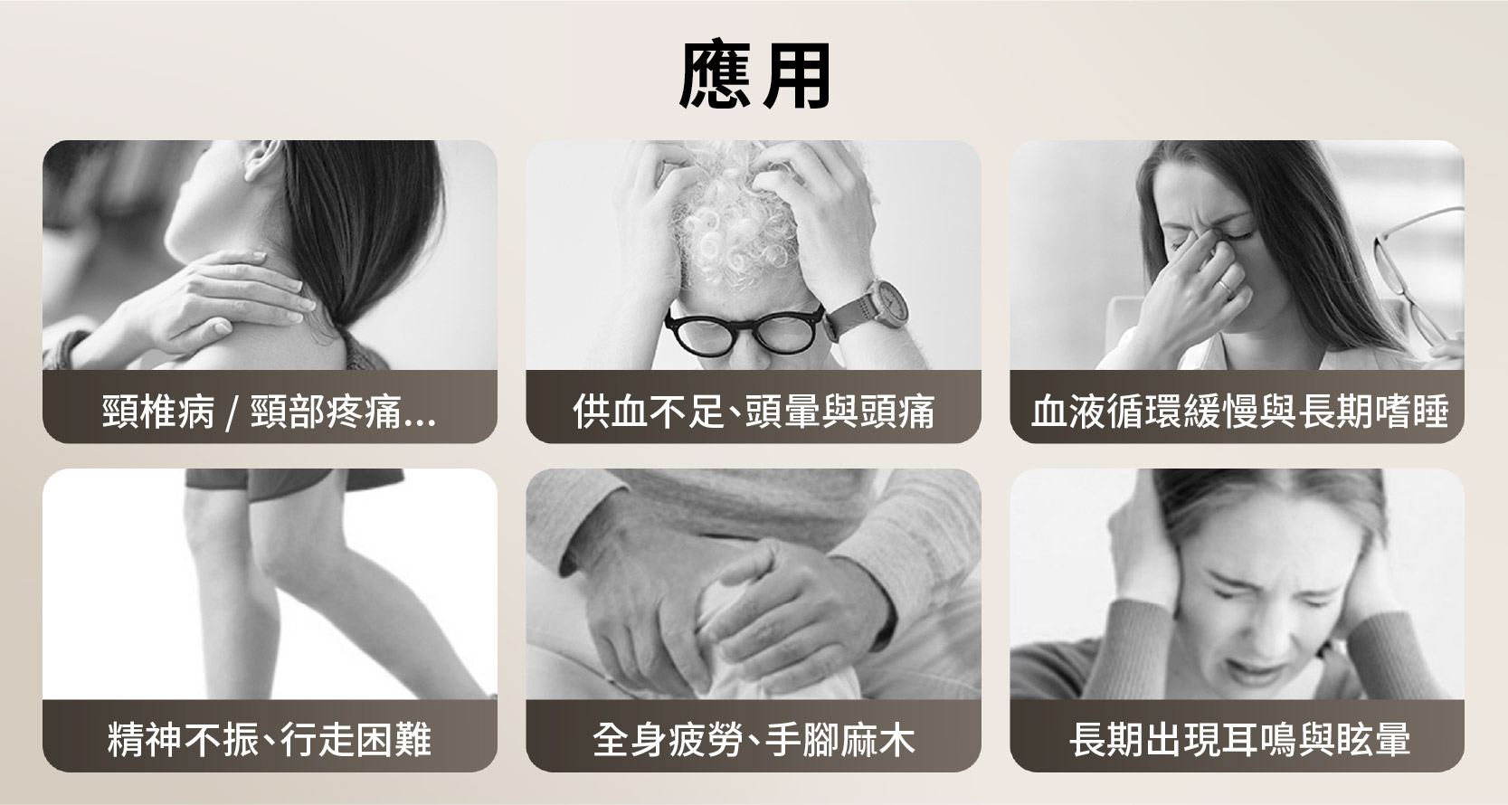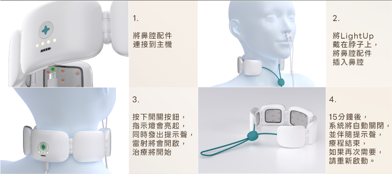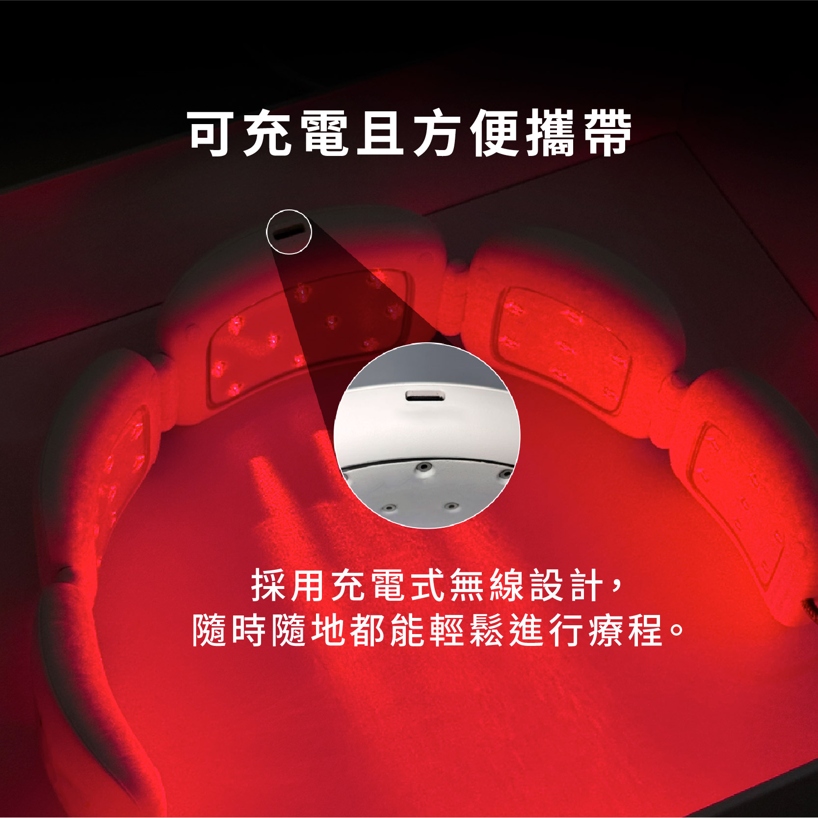 基於人體工學的五軸鉸鏈結構,設備可從 40° 到 220° 自由折疊,完美適應頸椎的生理曲度與頸部肌肉的方向。表面由親膚材質製成,配有收縮帶(可適應各種頸圍)。