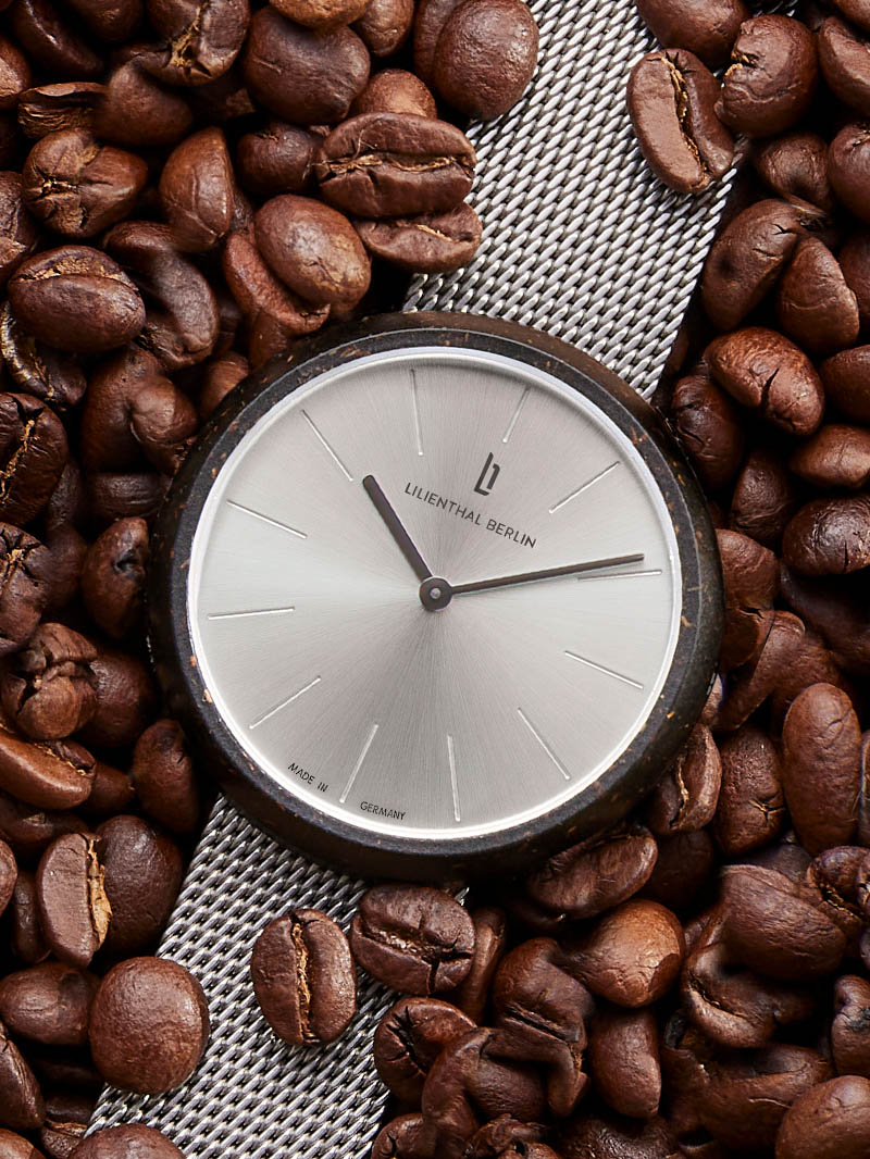 Lilienthal Berlin 設計這款手錶時,採用了簡約的包豪斯風格表盤,配有細微的太陽紋效果和纖細的時針和分針,使其顯得休閒且低調。核心由不銹鋼製成,確保手錶能夠持續多年。最後,為了讓Coffee Watch能夠始終準確顯示時間,還採用了瑞士製造商Ronda的可靠且超精確的石英機芯。Lilienthal Berlin希望通過Coffee Watch展示可持續生活方式,以看似無用的咖啡渣製作手錶,兼具優越品質和可持續性。