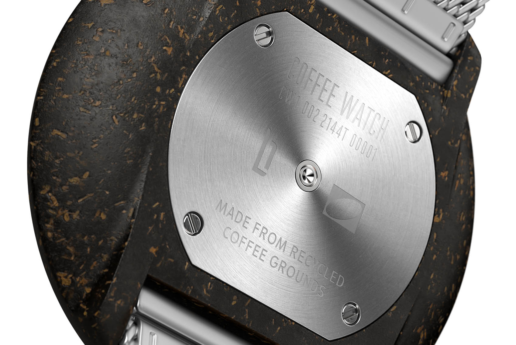 錶殼由使用過的咖啡渣製成,透過Kaffeeform開發的獨特再生工藝轉化為耐用材料。 - 咖啡製造工藝