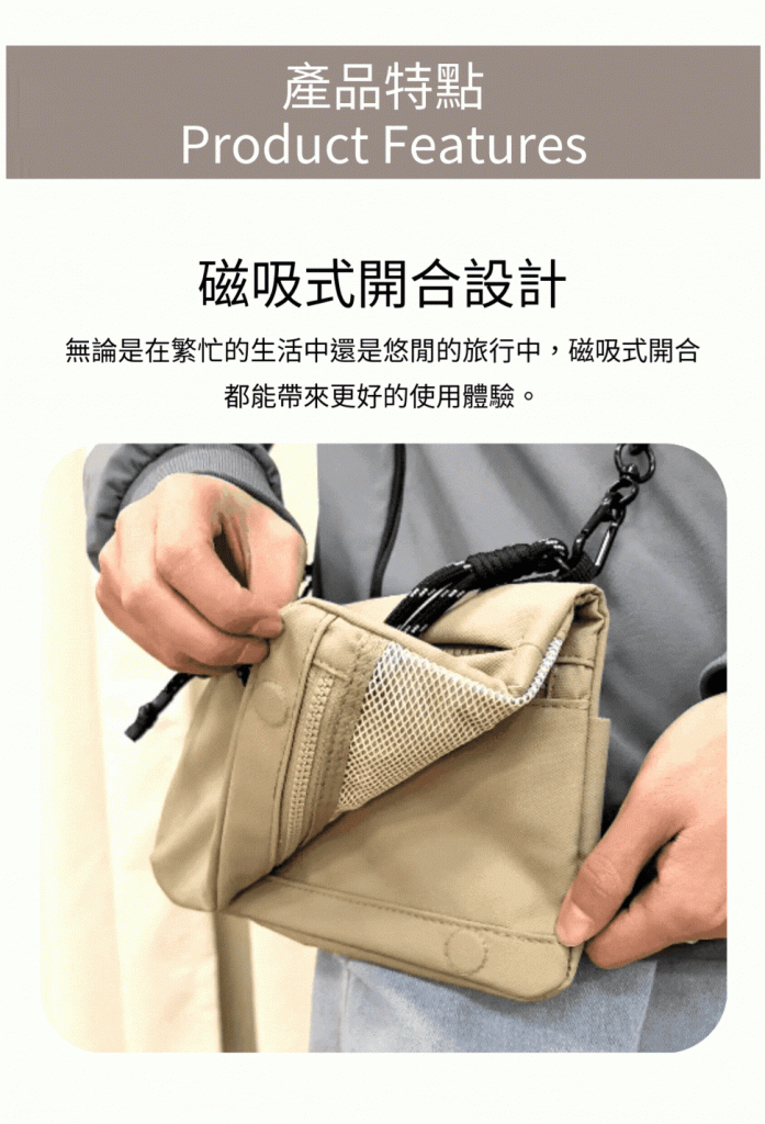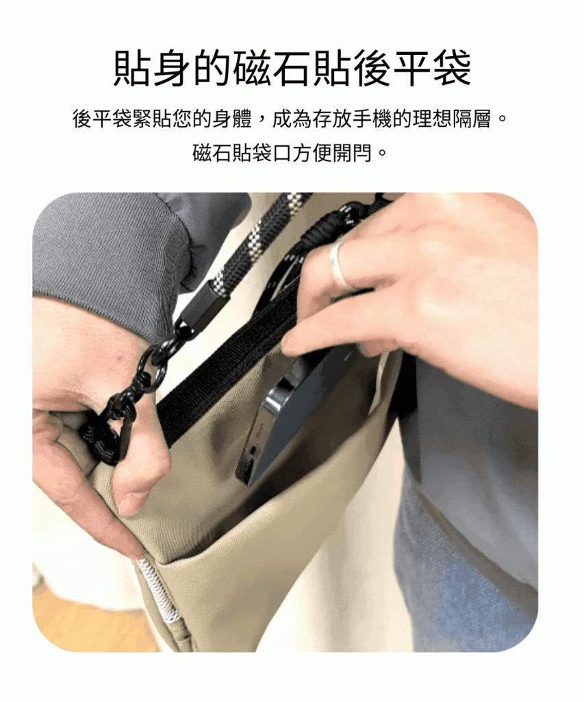 - 後平袋以磁吸式開關,可放手機