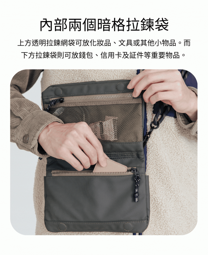 - 內部下方拉鏈袋,可放現金或證件等重要物品
