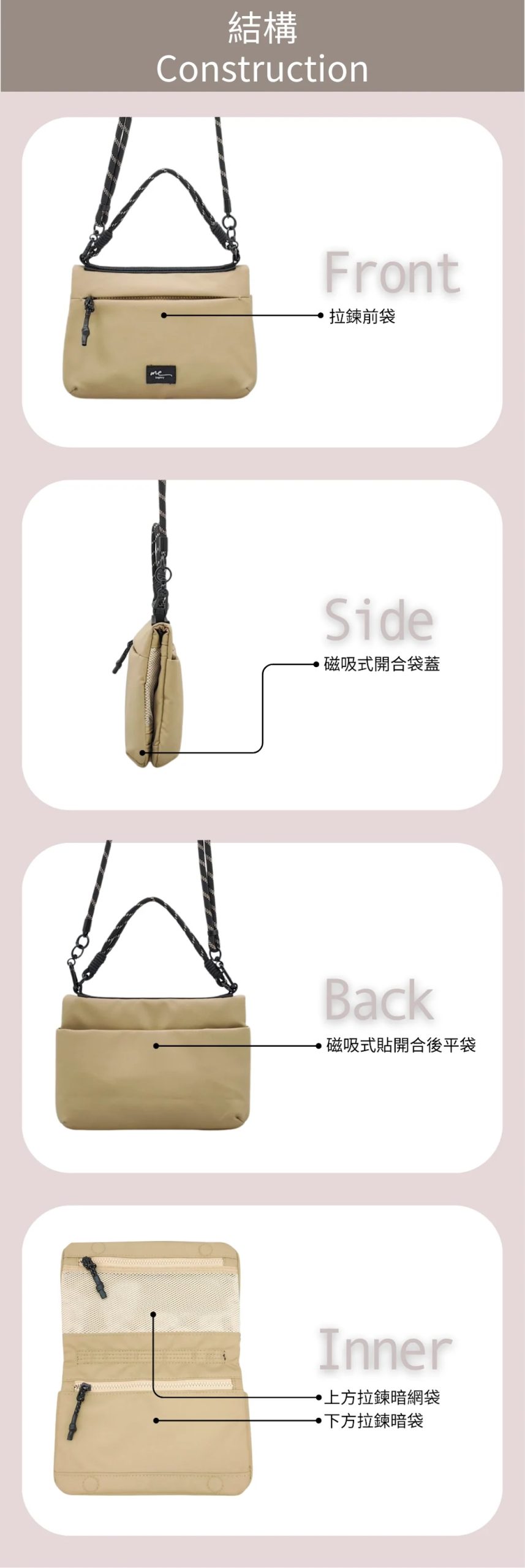 - 結構:1個拉鍊前袋+1個磁石貼後袋;內部1個拉鍊網袋+1個拉鍊袋
