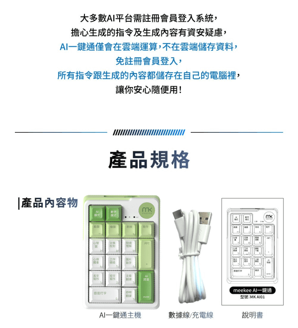 A: 淘寶上的同類商品主要針對中國市場銷售,採用的是簡體鍵盤印刷,簡體的軟體介面,並且使用Deepseek等中國模型,僅能生成以當地為主的簡體中文內容;AI一鍵通是全繁體中文介面,採用如ChatGPT等多款美國知名的AI模型,並且能生成台灣/香港在地的繁體中文化內容,本質上僅是外觀相似,並且在香港地區不需要透過VPN使用,實際上是在體驗上截然不同的產品。
