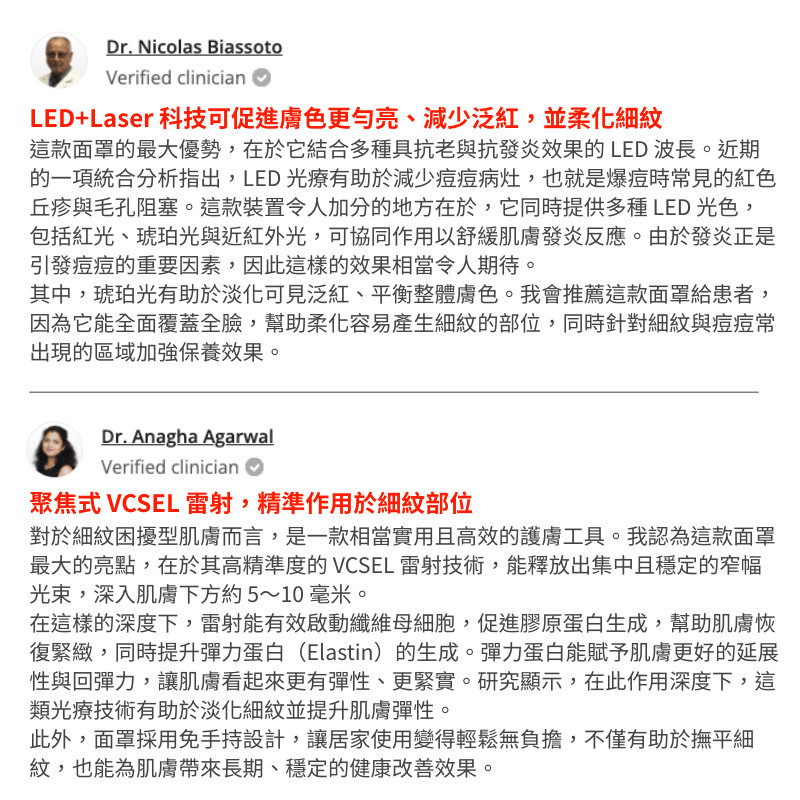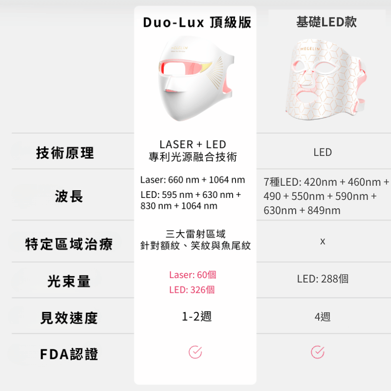- 3.0 Duo-Lux 面罩(頂級款):最完整的抗老方案,舒適度最佳,全臉融合雷射 + LED 技術,效果最強。