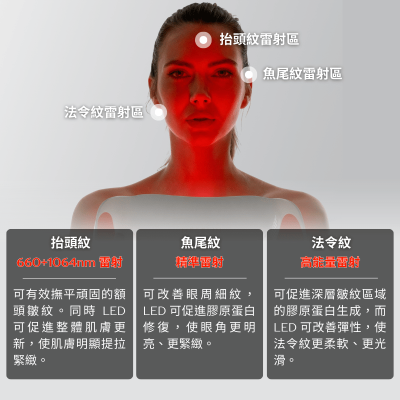 - 2.0 Laser+ LED 面罩(進階款):針對明顯老化,改善額頭紋、笑紋、魚尾紋及色素沉著。