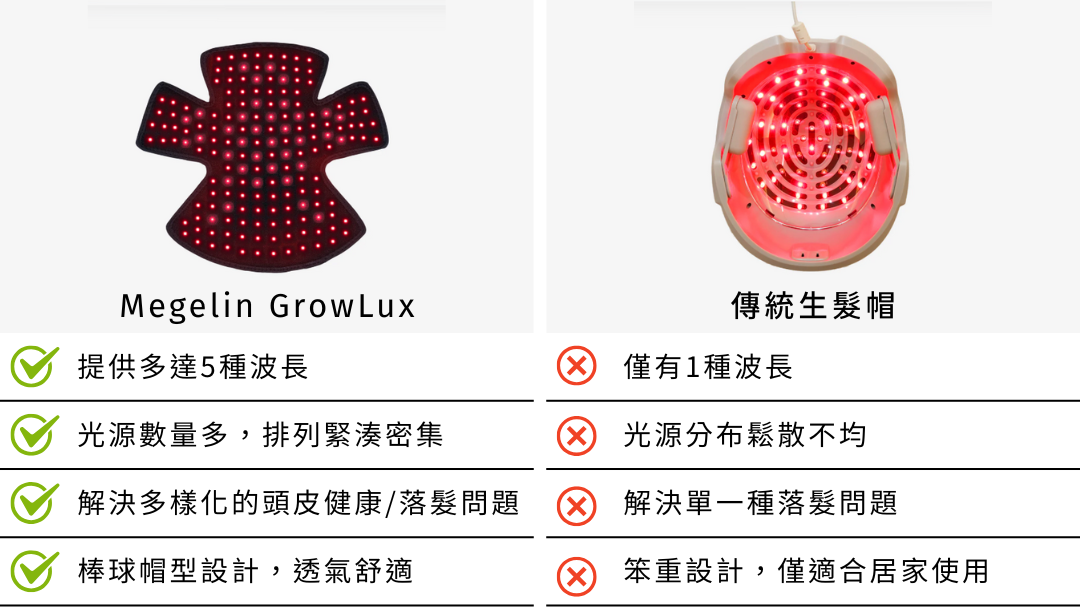 A:GrowLux 結合 630nm、660nm、810nm、850nm、1064nm 五種波長,透過 VCSEL 雷射 + 三晶片 LED 雙光源設計,同時進行深層毛囊激活與全頭皮光療,打造完整的生髮條件。