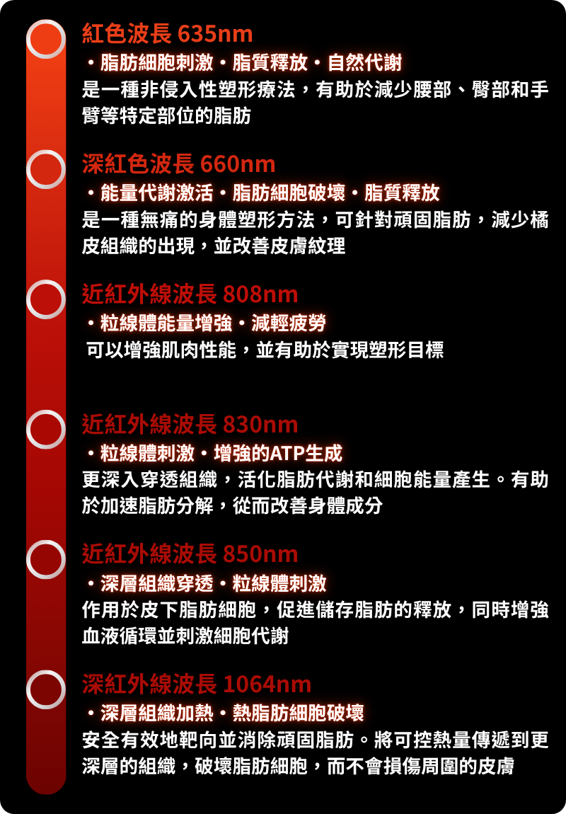 🔹 635nm、808nm、830nm 波長:可促進脂肪代謝和膠原蛋白再生,在4-6 週內重塑輪廓並減少皺紋。