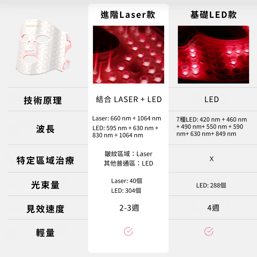 - LED(光療):屬於廣域光源,穿透力較淺,適合改善膚色、減少細紋、舒緩痘痘等日常肌膚問題。強度溫和,適合日常保養使用。