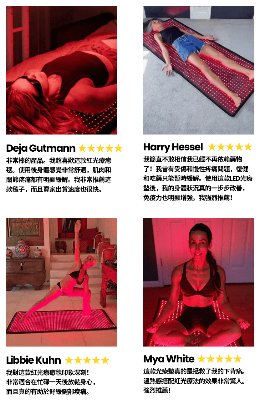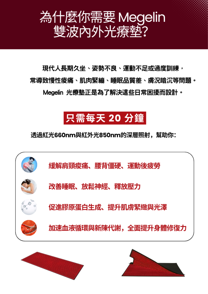 Megelin 雙波紅光療癒墊在光照強度、LED數量、波長配置與覆蓋範圍上,皆優於市面其他產品。採用3合1晶片技術與高彈柔軟材質,不僅提升療效表現,更兼顧使用舒適與全身照射需求,是高效居家光療的首選。