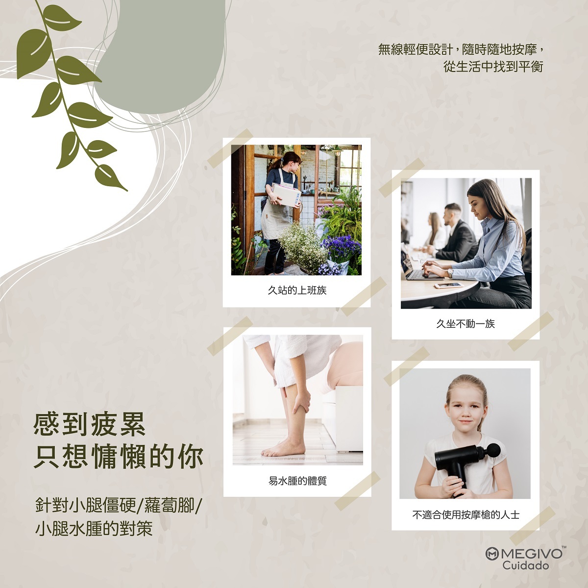 * Cuidado針對小腿僵硬、小腿水腫,久坐不動一族; 久站的上班族; 易水腫的體質; 運動後; 及不適合使用按摩槍的人士都適用