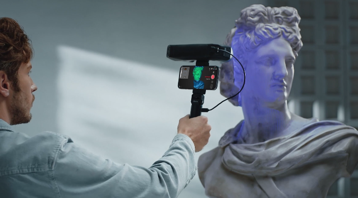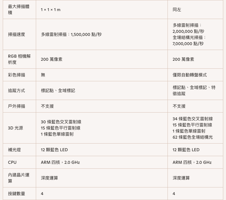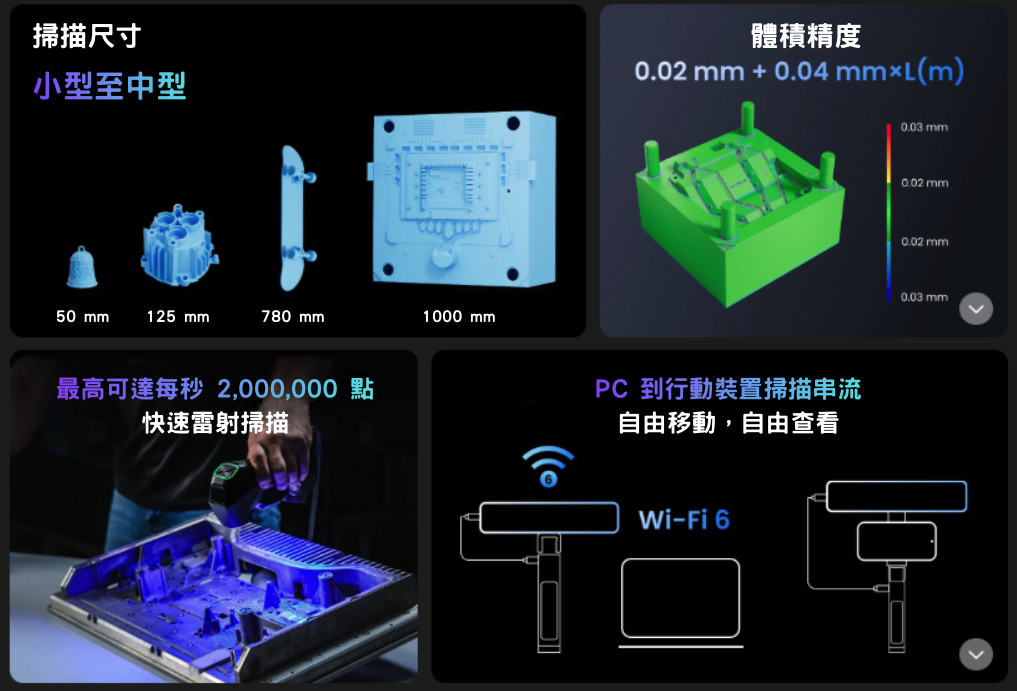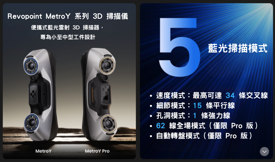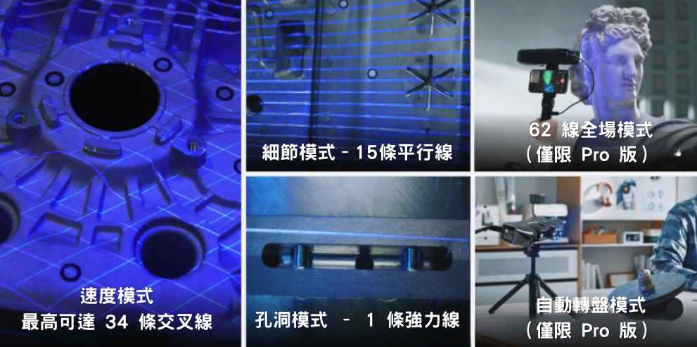 同時,藍光投影模組提供快速的 **手持全場掃描**,以及超精細的 **自動轉盤模式**,讓你在不同場景下都能獲得精準且高效的 3D 數據。