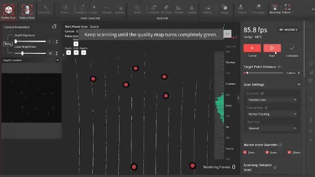 MetroY 的交叉線藍光雷射模式每秒可捕捉高達 200 萬個點,提供快速且精準的掃描結果。