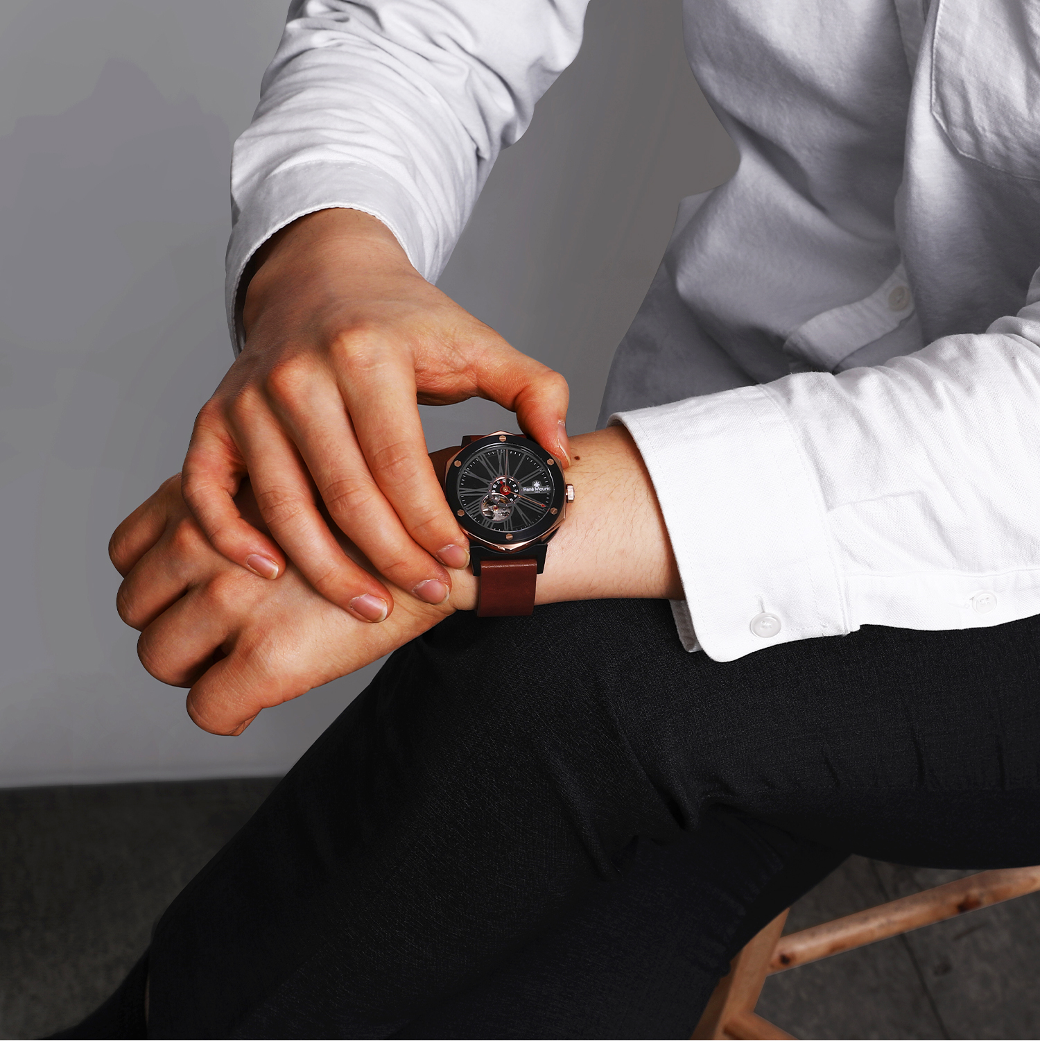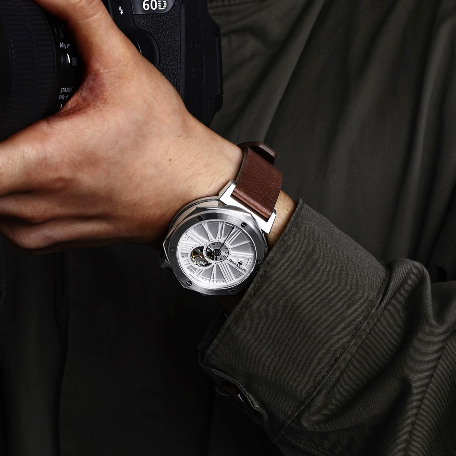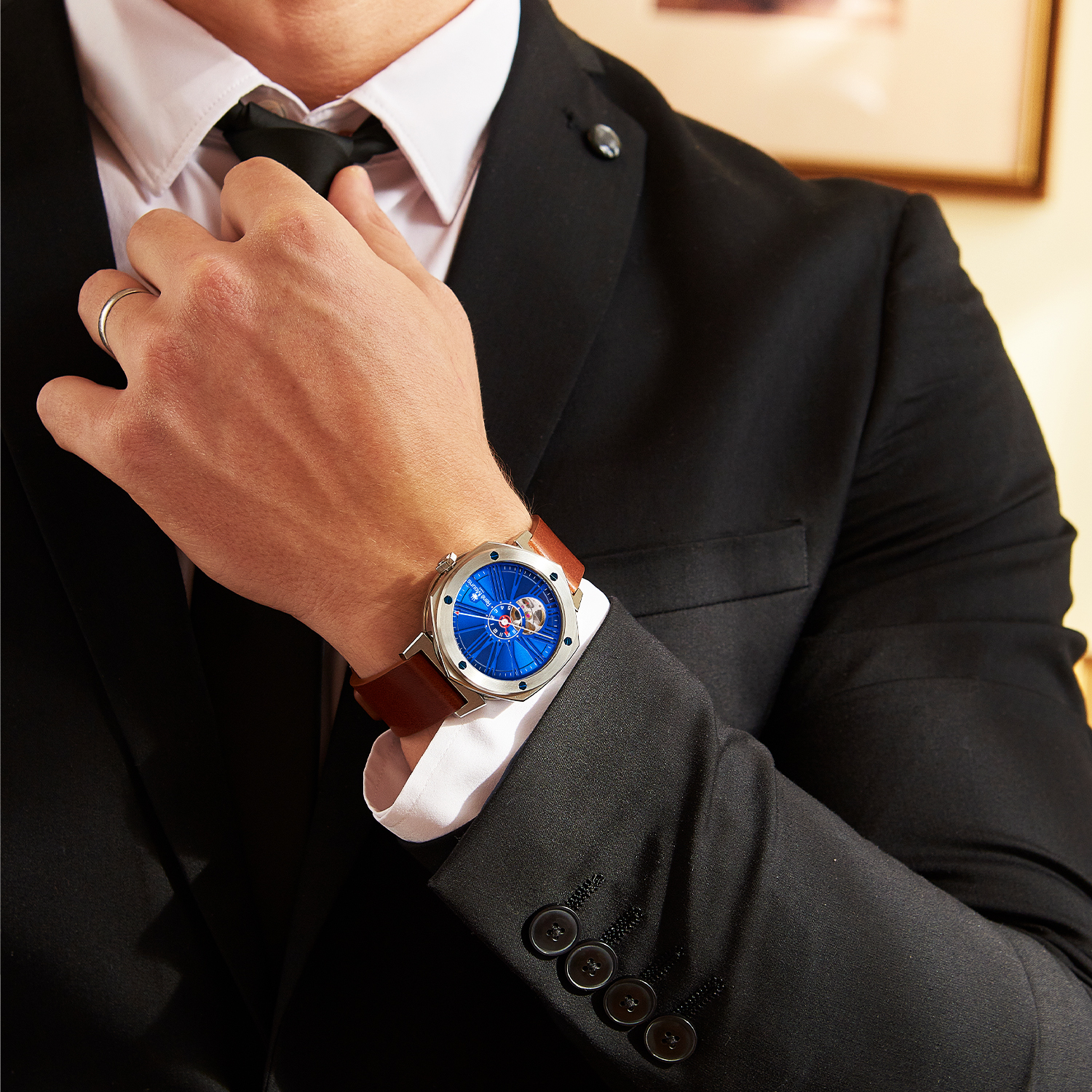 自動心跳: 自供電的日本自動機芯讓您無需電池即可準時走時。半鏤空錶盤展現其韻律脈動,展現令人著迷的機械男錶藝術。