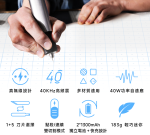 NeoBlade 的超音波震動技術高達40KHz,每秒高達40,000次的震動頻率,讓每次切割都更加精準且順滑。切割過程就像熱刀切黃油一樣順滑,輕鬆應對各種材料,完美切割不留痕;不只如此,傳統切割刀通常需要扭轉手腕施加力量進行切割,長時間下來常常造成肌肉酸痛,而NeoBlade則無需額外施力便可精準完成切割,減少了不必要的體力消耗。