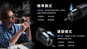 在具體的應用場景中,精準模式可以使用在需要高度控制的工作,木工定點修整、3D列印模型修整、修整、去毛邊、細微調整及細節雕刻,最大限度提供高精度。相對的,連續模式更適合大範圍的切割工作,如 分割、雕刻、開槽、刻劃、皮革雕花或模型改造等場景,提供穩定且持久的切割效果,避免頻繁停頓。如此雙模式的切換設計,讓NeoBlade在各種材料需求中皆能提供最理想的效果,從精密操作還是高效切割,都是最佳選擇。