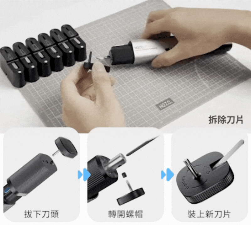 • 經典刀片:日常切割工作,如紙張、塑膠板…等,適合用於模型製作或是修邊。