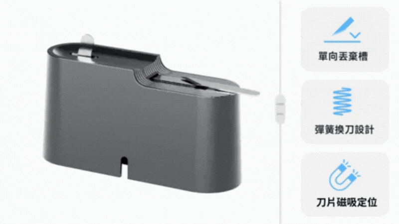 在刀片收納設計上,HOZO 也花了很多心思,結合市面上實際遇到的問題與使用者習慣反饋,以往使用者廢棄刀片時,因為沒有專用回收盒,只能直接當一般垃圾丟棄或自行用紙捲起後丟棄,這大幅度增加的清潔人員處理垃圾時受傷的風險。因此,NeoBlade的收納盒配有單向刀片廢棄槽,用完投入即丟,降低後期刀片處理的安全隱患。