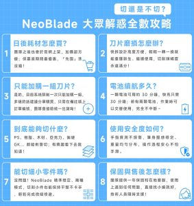 為了提高收納安全性與便捷性,NeoBlade的桌面設計將 機身、充電座、刀片盒合而為一;刀片收納盒採用一次一片安全取用設計,出刀口上方增加了磁吸功能,在更換不同種類刀片時,可以將刀片暫時性的吸住存放。同時不同刀片盒還可以利用卡榫設計,與充電座模組式合體存放。