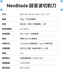 與依賴高溫融化材料的熱刀不同,NeoBlade透過刀片每秒數萬次的縱向高速微振動,利用 極高頻率與極小幅度對刀刃接觸面進行持續切割,促使材料在微觀層面發生斷裂,從而 實現低阻力、高效率的切割效果,保持 穩定的切割效果,避免了材料邊緣融化或不平滑的情況。