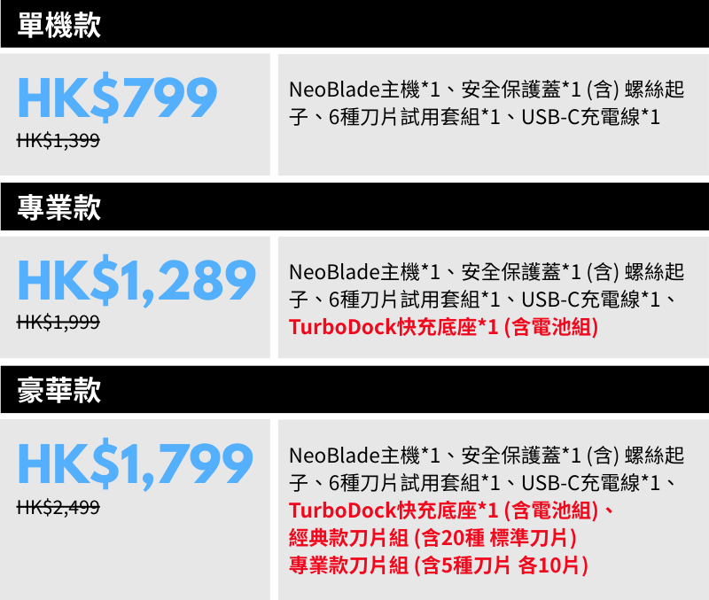 一把刀,可以有好多面向;NeoBlade 則有 1+5種專用刀片盒。與傳統切割刀相比,NeoBlade的專用刀片盒設計採用模組化連接結構,一共6種不同刀片盒可供選擇,每盒內含大容量刀片 經典刀片*20片、長刃刀*10片、鏟刀*10片、小鏟刀*10片、曲線刀*10片、雙刃刻刀*10片;無需額外工具或繁瑣步驟,這樣的靈活性足夠面對各類切割需求,針對不同材料和使用場景進行優化;無論是精細的修整工作,還是大範圍的切割任務,都能輕鬆應對。