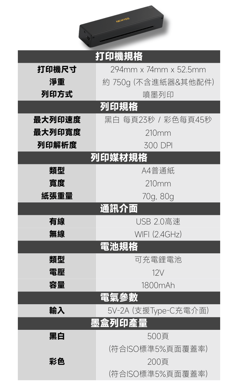 A: 一次充滿電約 2小時,充滿電可待機 30天,可打印約 80頁,實際打印頁數需查看打印內容而定。