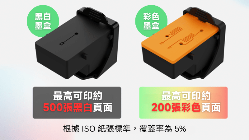 根據 ISO 紙張標準,覆蓋率為 5%,一個黑白墨盒最高可印約 500 張;而一個彩色墨盒最高可印約200 張頁面。