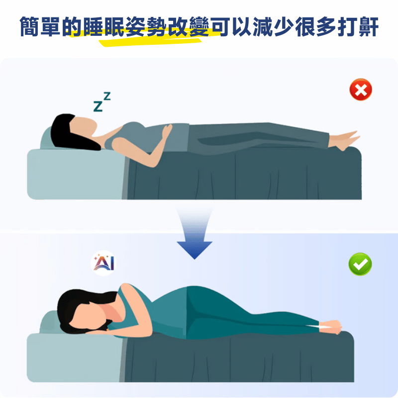 A: 對許多人來說,側睡姿是減少打鼾的有效一線策略,因為它可以減輕氣道的重力塌陷。然而,側睡姿並非萬靈丹。假設有人即使側躺也持續打鼾或打鼾聲很大。在這種情況下,這更可能表明其他潛在因素(例如酒精、吸煙、肥胖、睡眠階段或睡眠呼吸中止症)可能正在起作用。