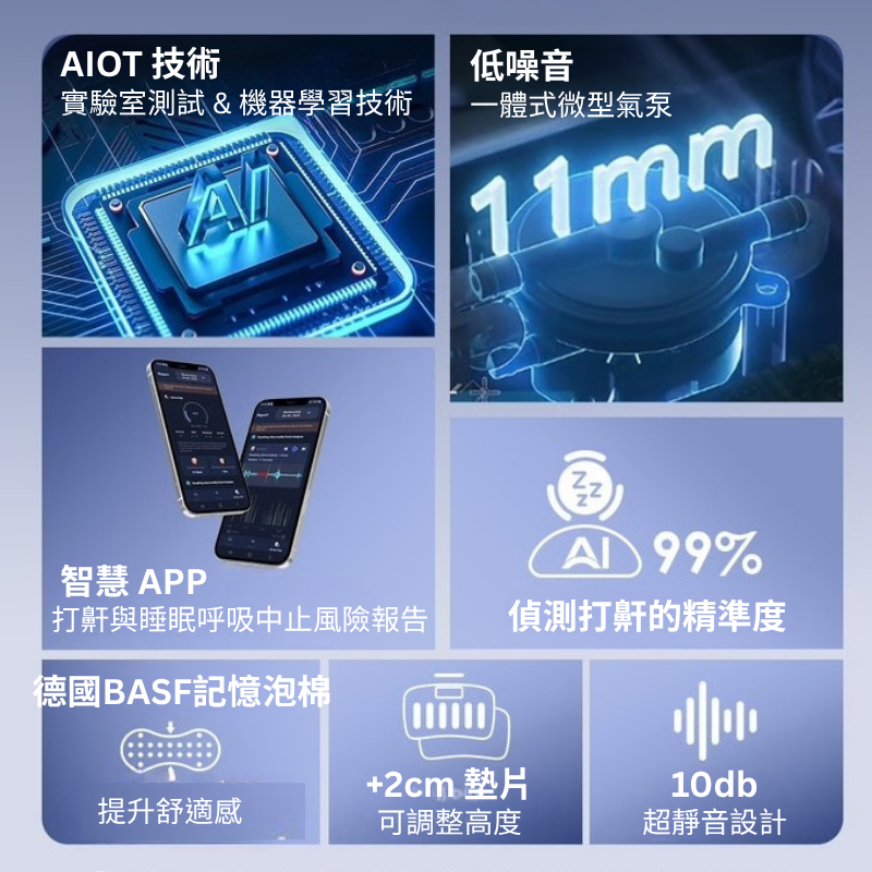 內建的六個獨立氣囊區域能夠各自運作,根據您的頭部動態與打鼾狀況,靈活且精準地進行微調,提供個人化的止鼾效果。