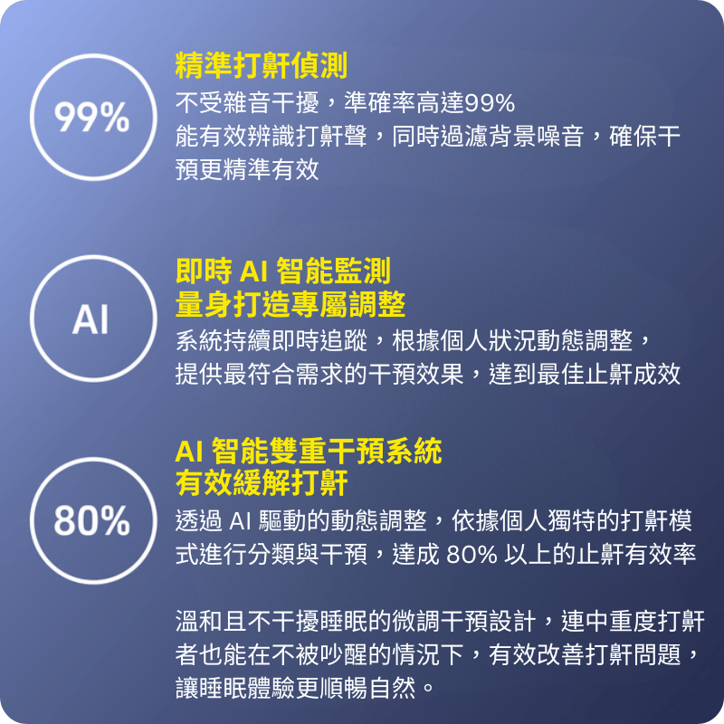 提供動態、多維 AI 智慧干預,帶來個人化的止鼾體驗,精準控制頭部旋轉角度、氣囊升起和介入速度: