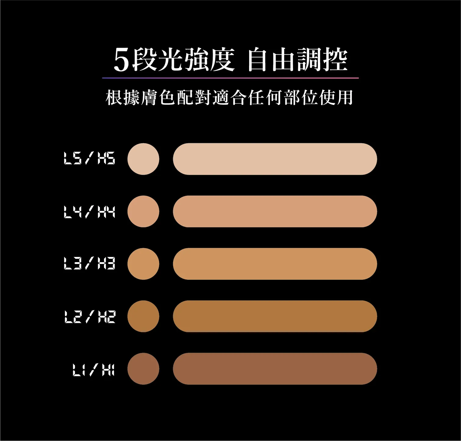 - 5段光強度 可根據膚色選擇 適合任何位置使用