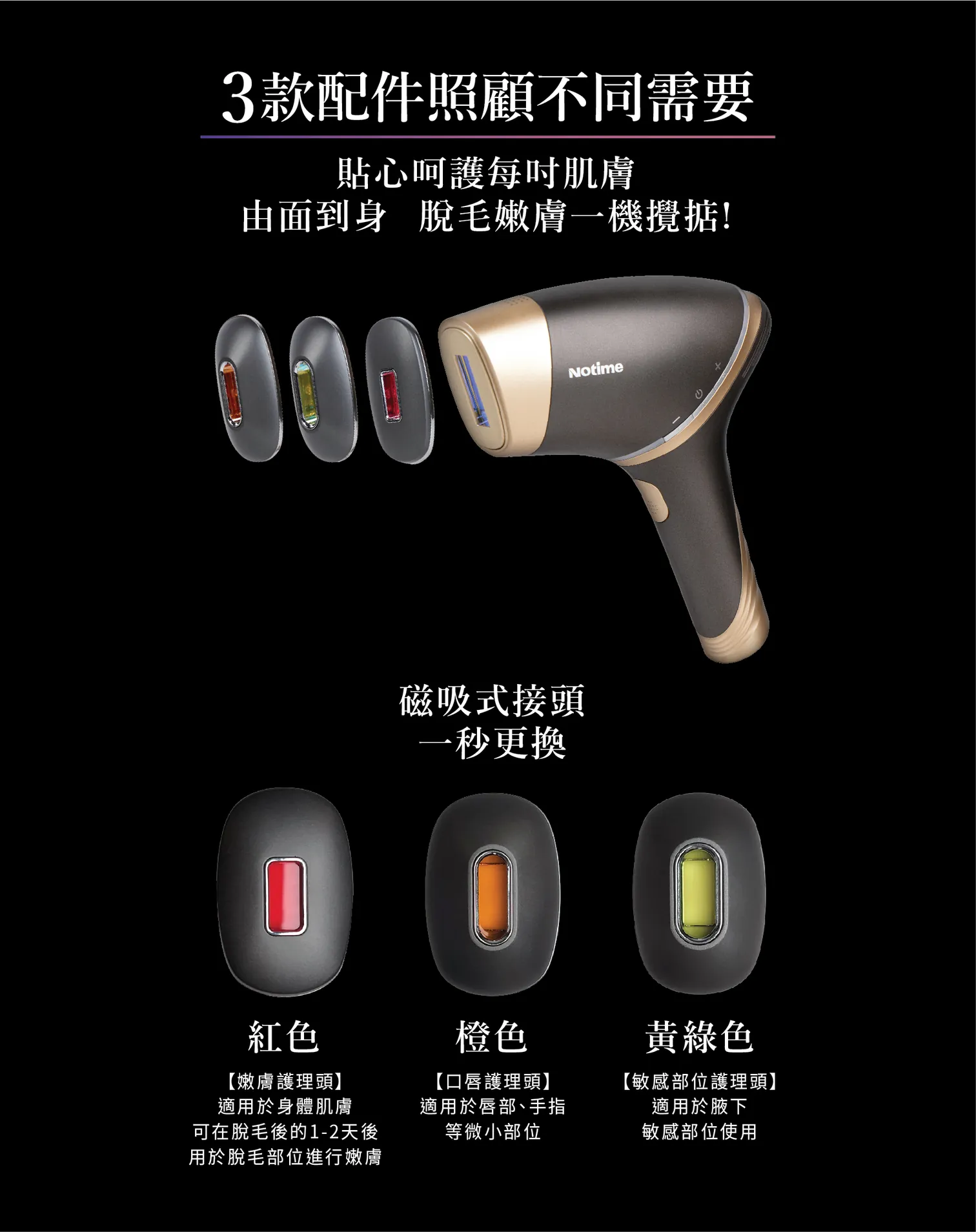 - 3款專用濾光配件,磁吸式接頭,一秒更換,針對不同身體部位需要
