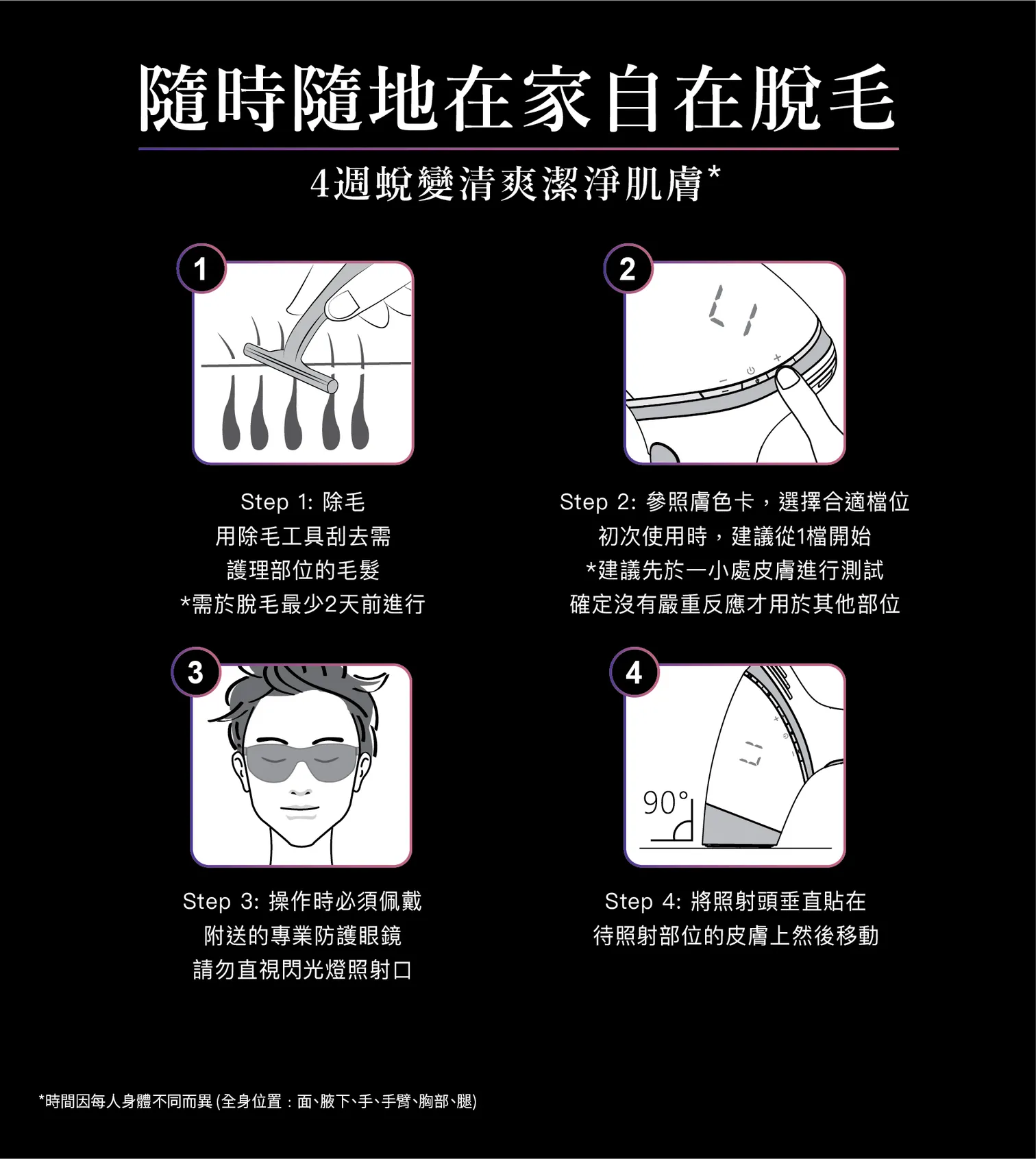 *功效時間因個人體質而異(例如毛髮濃密程度、皮膚深淺程度)