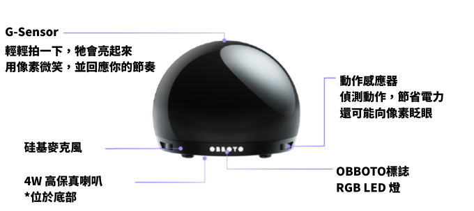 - 動作偵測:OBBOTO 唯一的感測元件是動作感應器,能偵測使用者是否在附近移動。