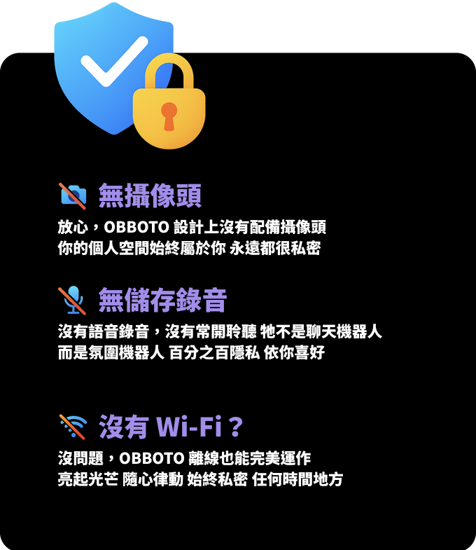 無攝像頭。無語音錄音。無常開的聆聽功能。只有純粹的像素個性,零監視。牠不是聊天機器人,而是氛圍機器人——讓你的空間保持屬於你。即使離線,OBBOTO 也能持續發光。沒有 Wi-Fi?不用擔心。你始終掌控一切,並且永遠處於私密模式。
