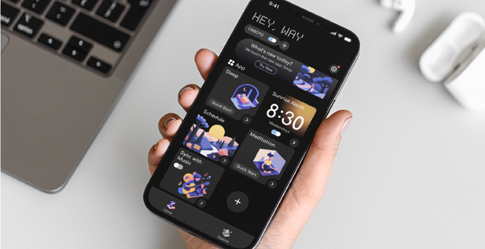 以柔和的日出光芒喚醒你。伴隨著海浪聲或白噪音入睡。當你感到「腦袋負荷過重」時,切換到冥想模式。需要高度專注?打開環境燈光,進入專注狀態。